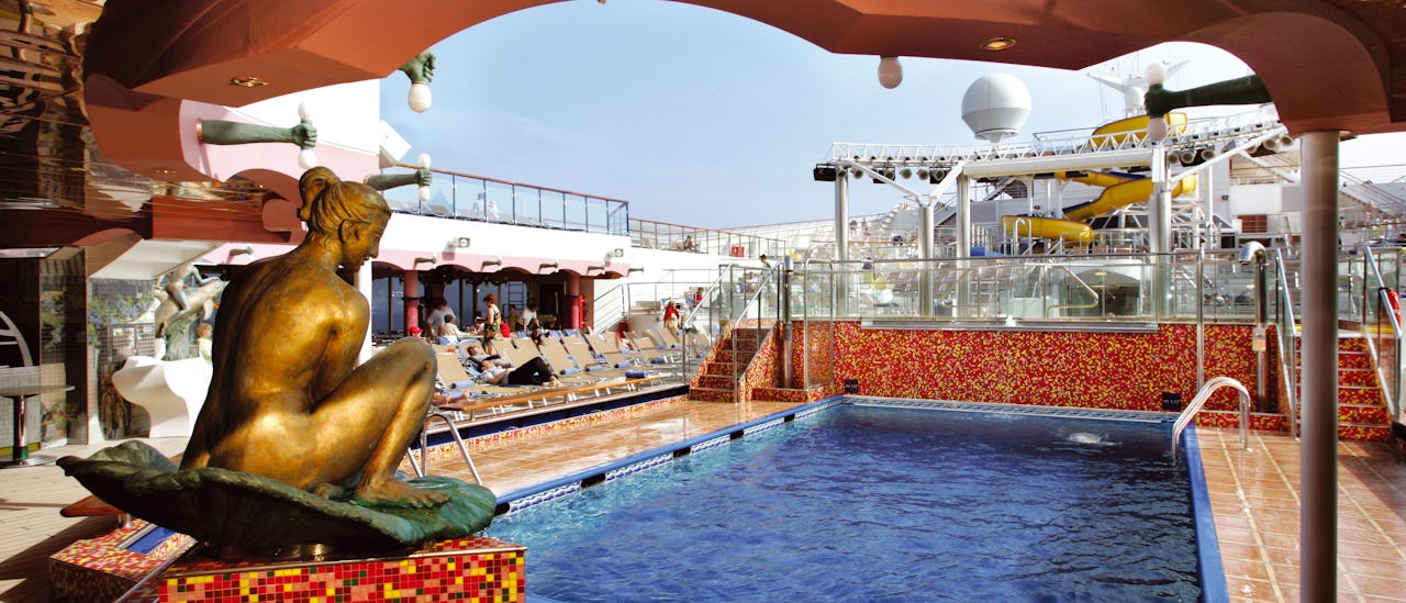 The Pool Deck, with its four pools, numerous jacuzzis, a water slide and a 194 sqft movie screen, is highly recommended to those looking for relaxation.