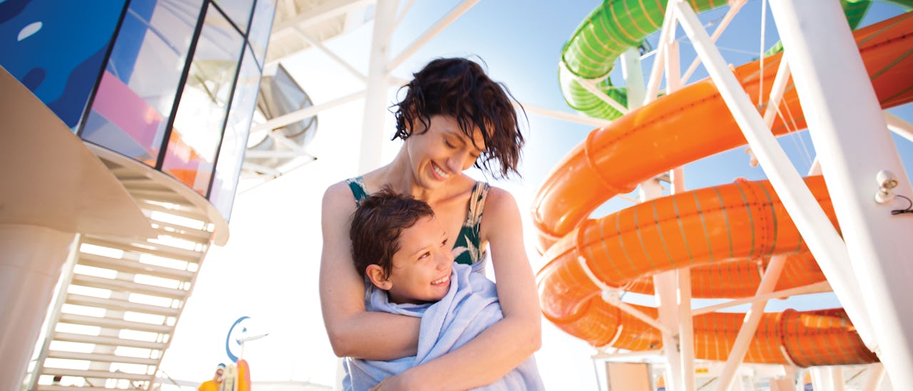The Flowrider surf simulator with the Perfect Storm waterslide in the background