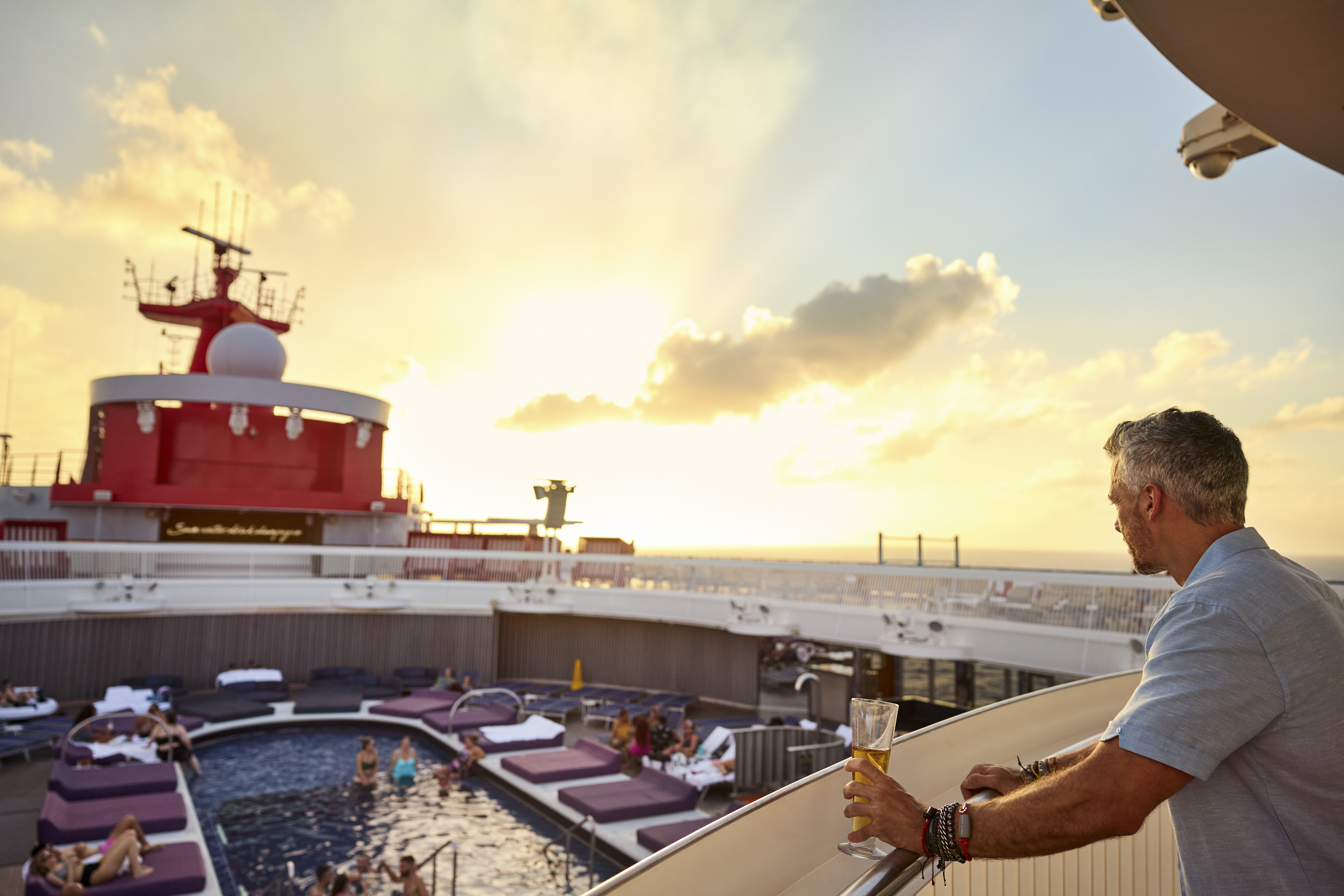 As you step aboard Valiant Lady, you’re immediately immersed in its lively and dynamic vibe. A glass-encased entrance, aglow with rainbow-colored lights, leads you to the mid-ship hub called "The Roundabout." With a DJ spinning vinyl and stylish baristas brewing coffee, the space feels more like the lobby of a trendy boutique hotel than a typical cruise ship atrium.